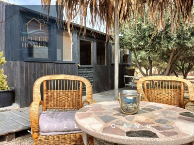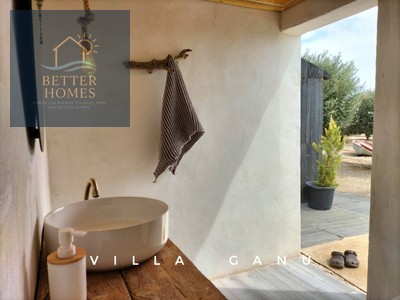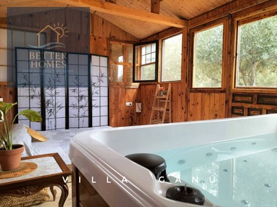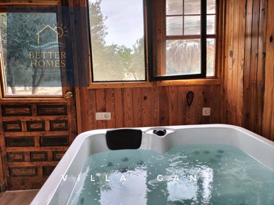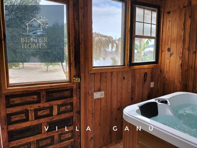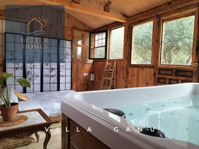 En el exterior encontrarás dos baños adicionales reformados, perfectos para dar servicio a las zonas comunes. Además, cuenta con una acogedora cabaña de madera estilo japonés, equipada con jacuzzi y cama japonesa, ideal para invitados o para disfrutar de momentos de relax.